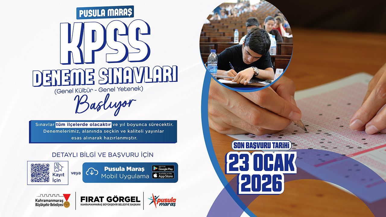 Ücretsiz deneme sınavlarına katılmak isteyen adaylar için başvurular başladı. Başvurular, Pusula Maraş mobil uygulaması üzerinden ya da https://kahramanmaras.bel.tr/duyuru/2025/12/31/kpss-deneme-sinavlari-basvuru-formu internet adresi aracılığıyla çevrimiçi olarak gerçekleştirilebiliyor. Son başvuru tarihi 23 Ocak 2026.