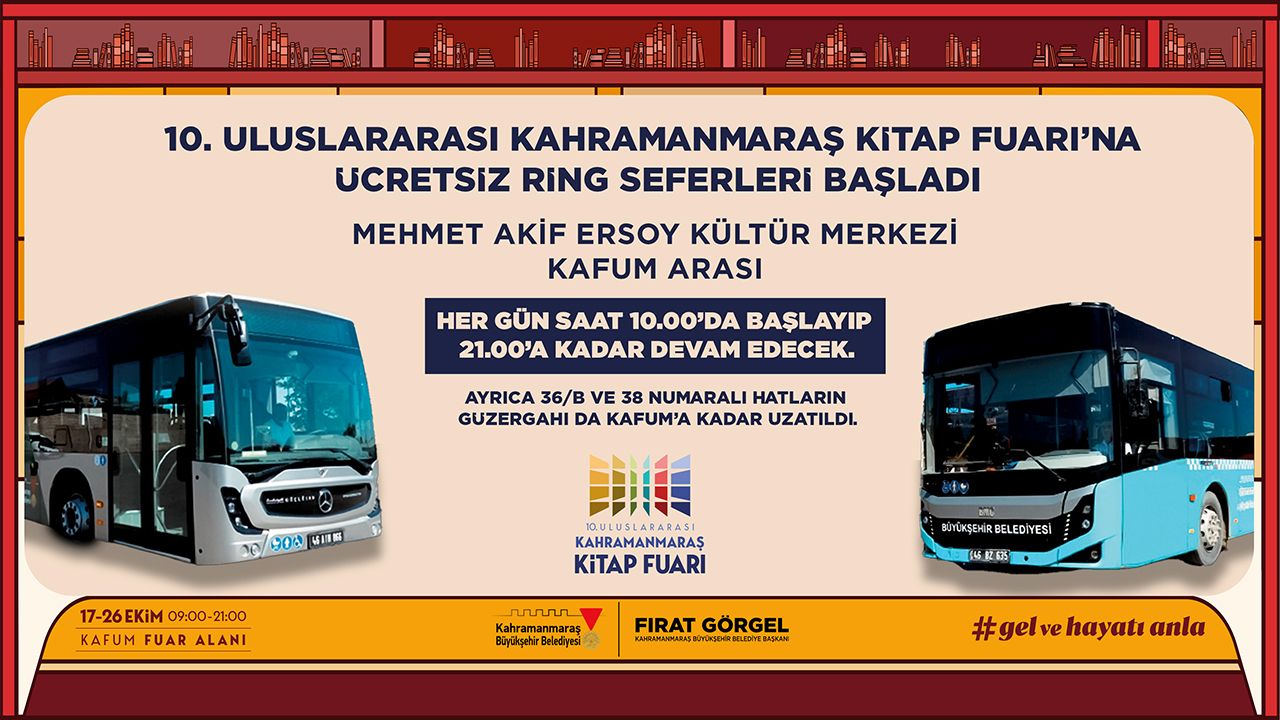 Kahramanmaraş Büyükşehir Belediyesi, Anadolu’nun en büyük kitap fuarı olma özelliğini taşıyan 10. Uluslararası Kahramanmaraş Kitap Fuarı’na vatandaşların daha rahat ulaşabilmesi için ücretsiz ring seferleri başlattı. Her gün binlerce ziyaretçiyi ağırlayan fuara ulaşımın kolaylaştırılması amacıyla hayata geçirilen uygulama, fuar süresince hizmet vermeye devam edecek. Her gün 10.00 ile 21.00 saatleri arasında düzenlenen ring seferleri, Mehmet Akif Ersoy Kültür Merkezi ile KAFUM arasında gerçekleştirilecek. Otobüsler KAFUM’dan 10.00’da seferlerine başlarken, Mehmet Akif Ersoy Kültür Merkezi’nden ise 10.30’da hareket edecek. Vatandaşlar, gün boyu birer saatlik aralıklarla düzenlenen seferlerle fuar alanına rahatça ulaşabilecek. Ayrıca toplu ulaşım ağında yapılan düzenlemeyle 36/B ve 38 numaralı otobüs hatlarının güzergahları KAFUM’a kadar uzatıldı. Böylece şehir merkezinin farklı noktalarından da fuar alanına kesintisiz ulaşım sağlanmış oldu.
