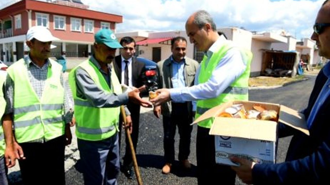 Döküm esnasında yaklaşık 120 derece sıcaklığa ulaşan asfalt üzerinde çalışan işçileri ziyaret eden Dulkadiroğlu Belediye Başkanı Necati Okay, çalışanlara dondurma ikram etti.