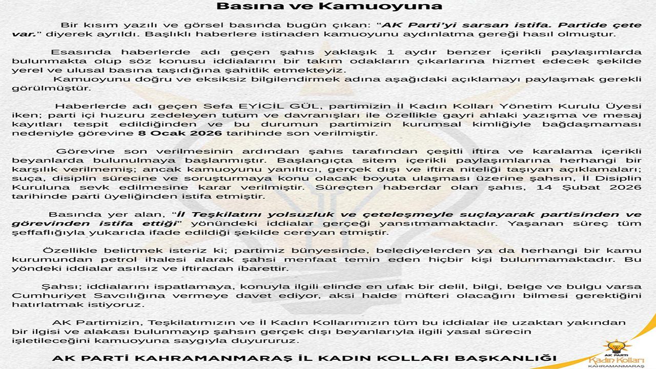 Açıklamada, görevden alınmasının ardından şahsın iftira ve karalama içerikli beyanlarda bulunduğu, kamuoyunu yanıltıcı ve gerçek dışı açıklamaların disiplin sürecine konu olacak boyuta ulaşması üzerine İl Disiplin Kurulu’na sevk edilmesine karar verildiği kaydedildi. Süreçten haberdar olan şahsın ise 14 Şubat 2026 tarihinde parti üyeliğinden istifa ettiği bildirildi.