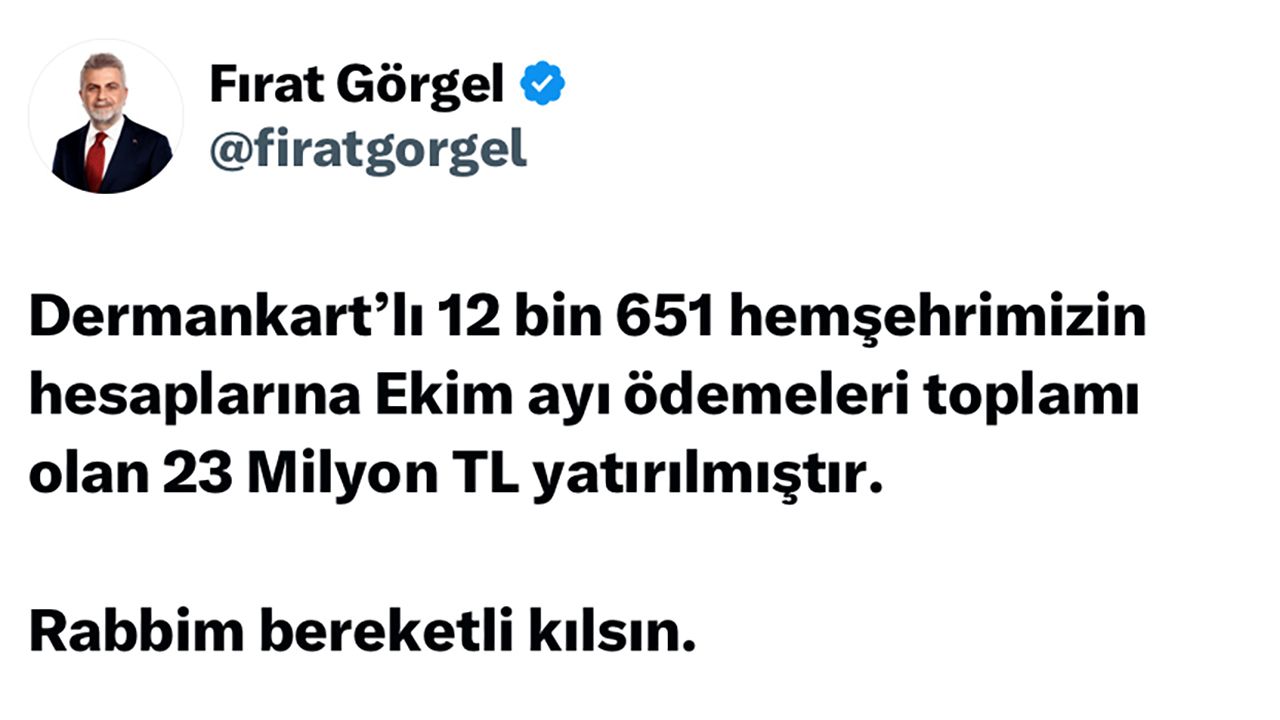 Büyükşehir Belediyesinin sosyal belediyecilik anlamında çalışmalarının kararlılıkla yürütüldüğünü ifade eden Büyükşehir Belediye Başkanı Fırat Görgel, “Bizler kimsenin yalnız olmadığı, dayanışmanın en güçlü şekilde yaşandığı bir şehir inşa ediyoruz. Bu kapsamda Dermankart’lı 12 bin 651 hemşehrimize Ekim ayında 23 Milyon TL maddi destekte bulunduk. Rabbim bereketli kılsın. Kahramanmaraş’ta sosyal belediyecilik anlayışımızı daha da güçlendirmeye kararlıyız. Her haneye dokunmaya, her gönüle ulaşmaya devam edeceğiz” cümlelerini kaydetti.
